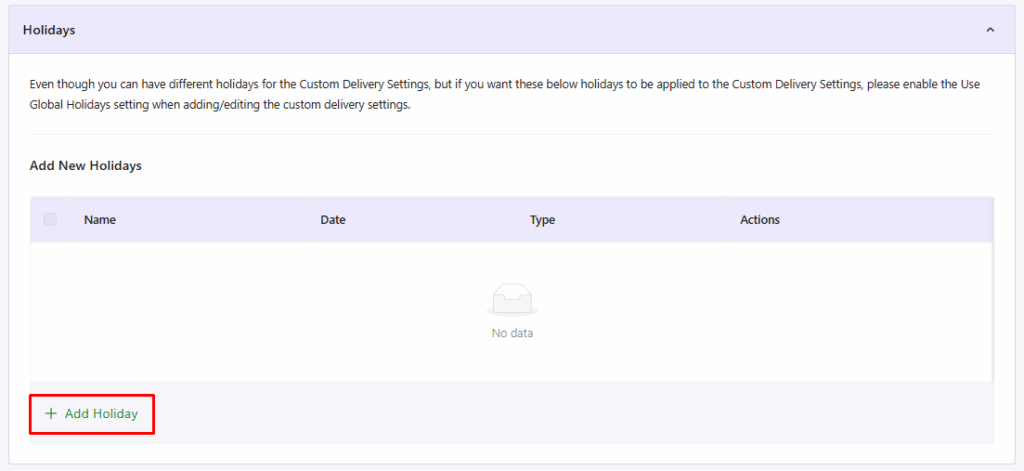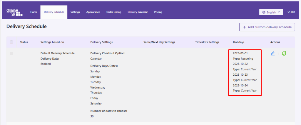 You can set holidays for your Custom Delivery Schedules just like you do for the Default Delivery Schedule. The only difference is that in Custom Delivery Schedules, you can decide whether you want the holidays added in the Default Delivery Schedule to be applied or not. This is controlled using the Use Global Holidays setting.