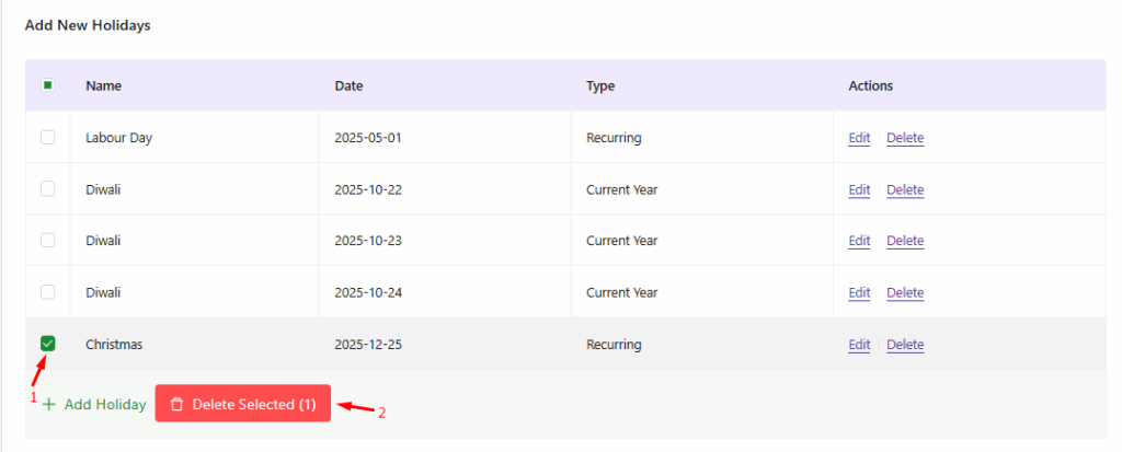 To remove any holidays, select the checkbox next to the holiday row and click the Delete Selected option.