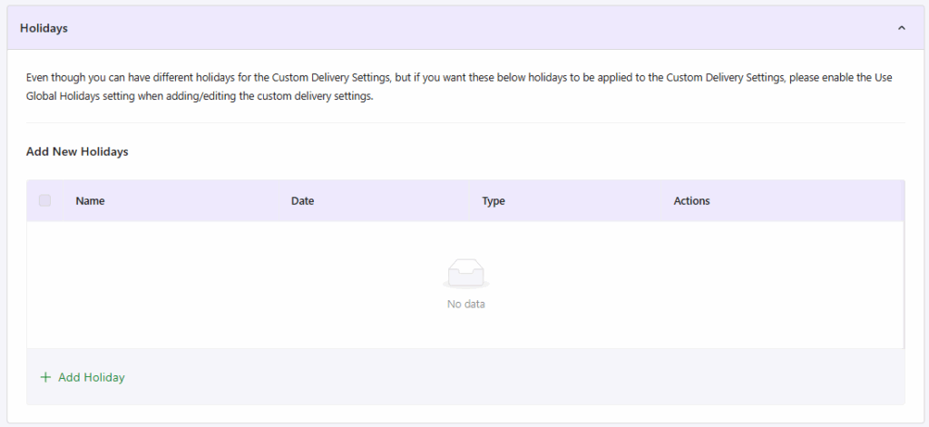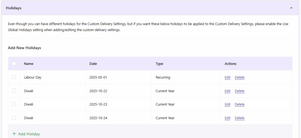 The Holidays feature lets you block specific dates, like holidays or festivals, from being available for delivery. For example, if your store does not deliver on Labour Day, you can add May 1st as a holiday.