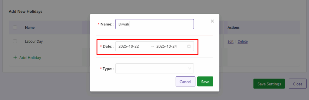 For example, if your Diwali holidays run from October 22nd to October 24th, you can set the Start date as October 22nd and the End date as October 24th.