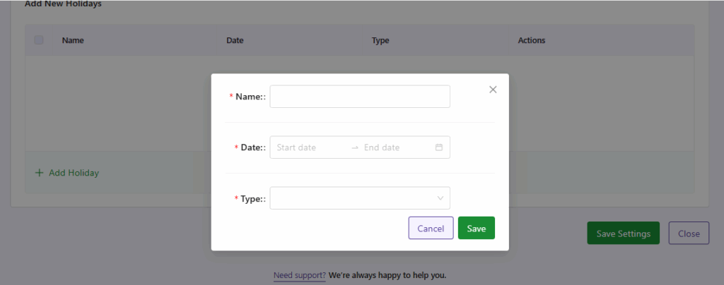 • Date: Select the start date for the holiday range you want to add. It allows you to block a single day or an entire date range.