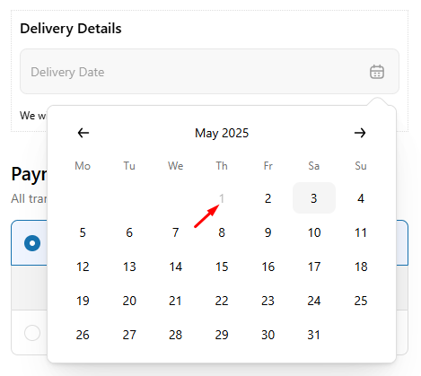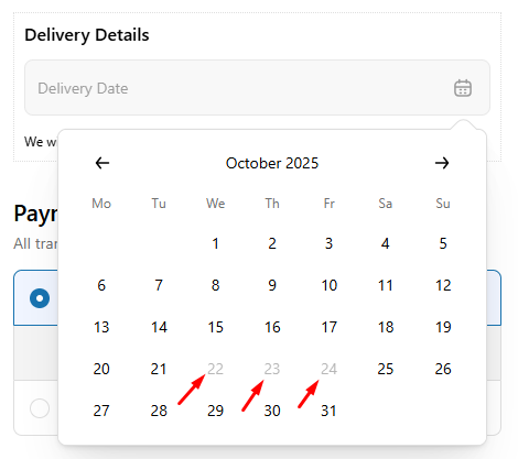 The Holiday dates that we have set, such as May 1st and October 22nd–24th, are disabled in the delivery calendar, ensuring customers can’t select them while placing their order.